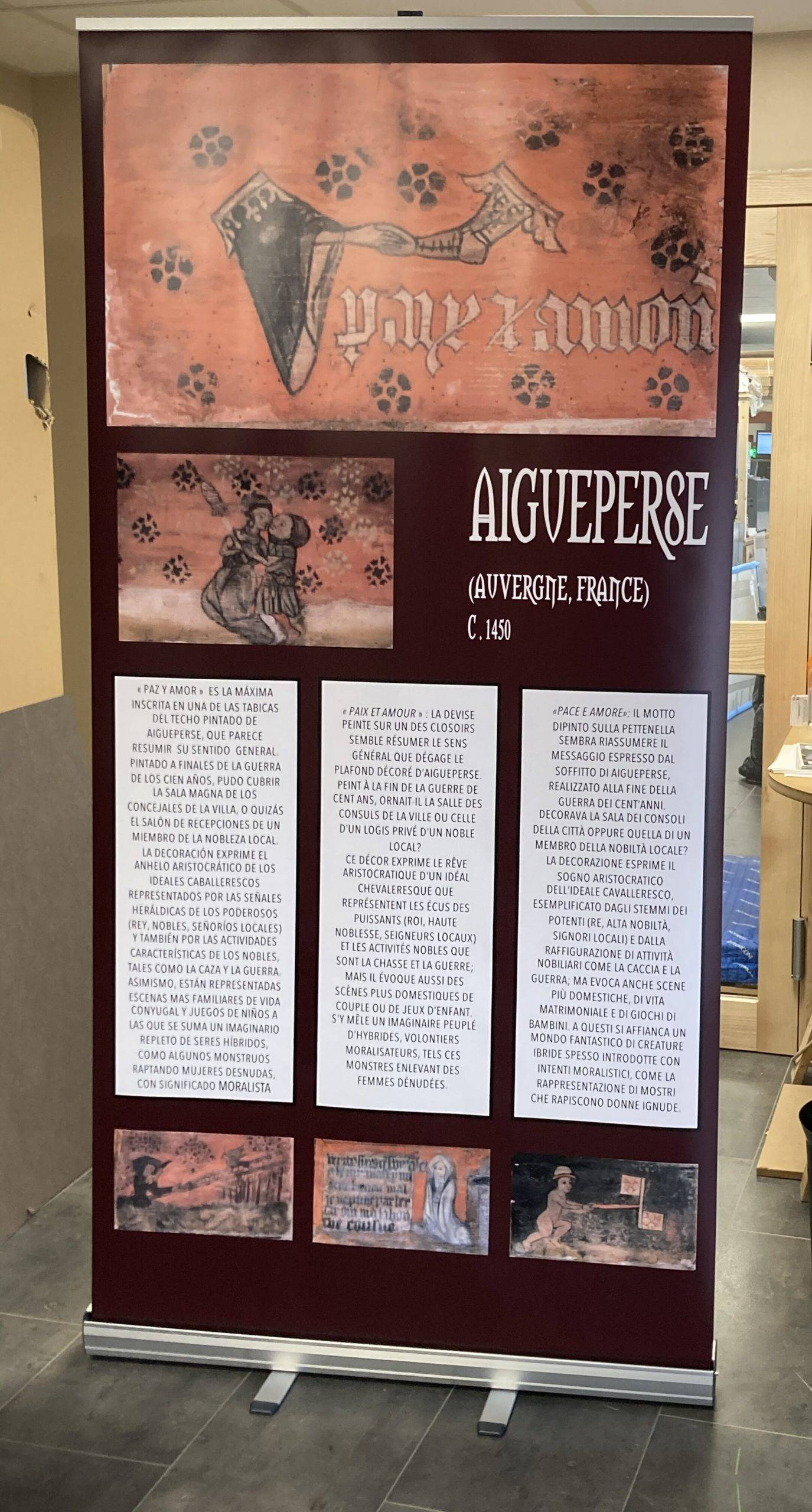 Cette exposition itinérante présentera un nouveau panneau sur les plafonds peints d’Aigueperse. Ce panneau autoportant de 2 m x 1 m adopte la même graphie que les 26 autres de l’exposition. Il est illustré d’une sélection de quelques tableautins aiguepersois, accompagnés d’une légende en trois langues (espagnol, français, italien). En accord avec la RCPPM, il a été financé par l’ACAE.