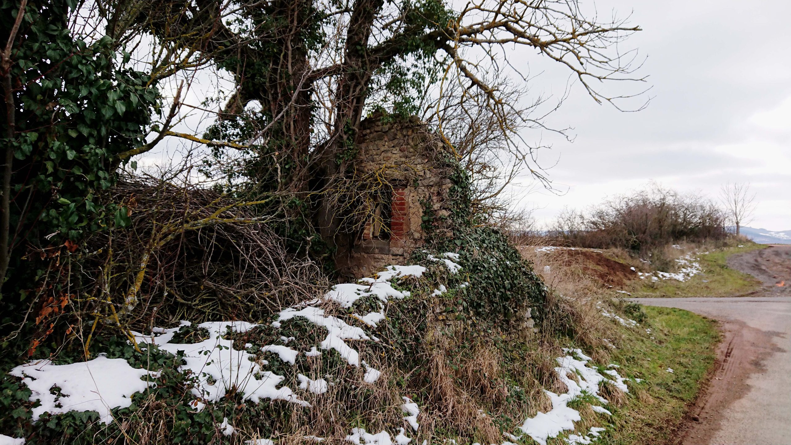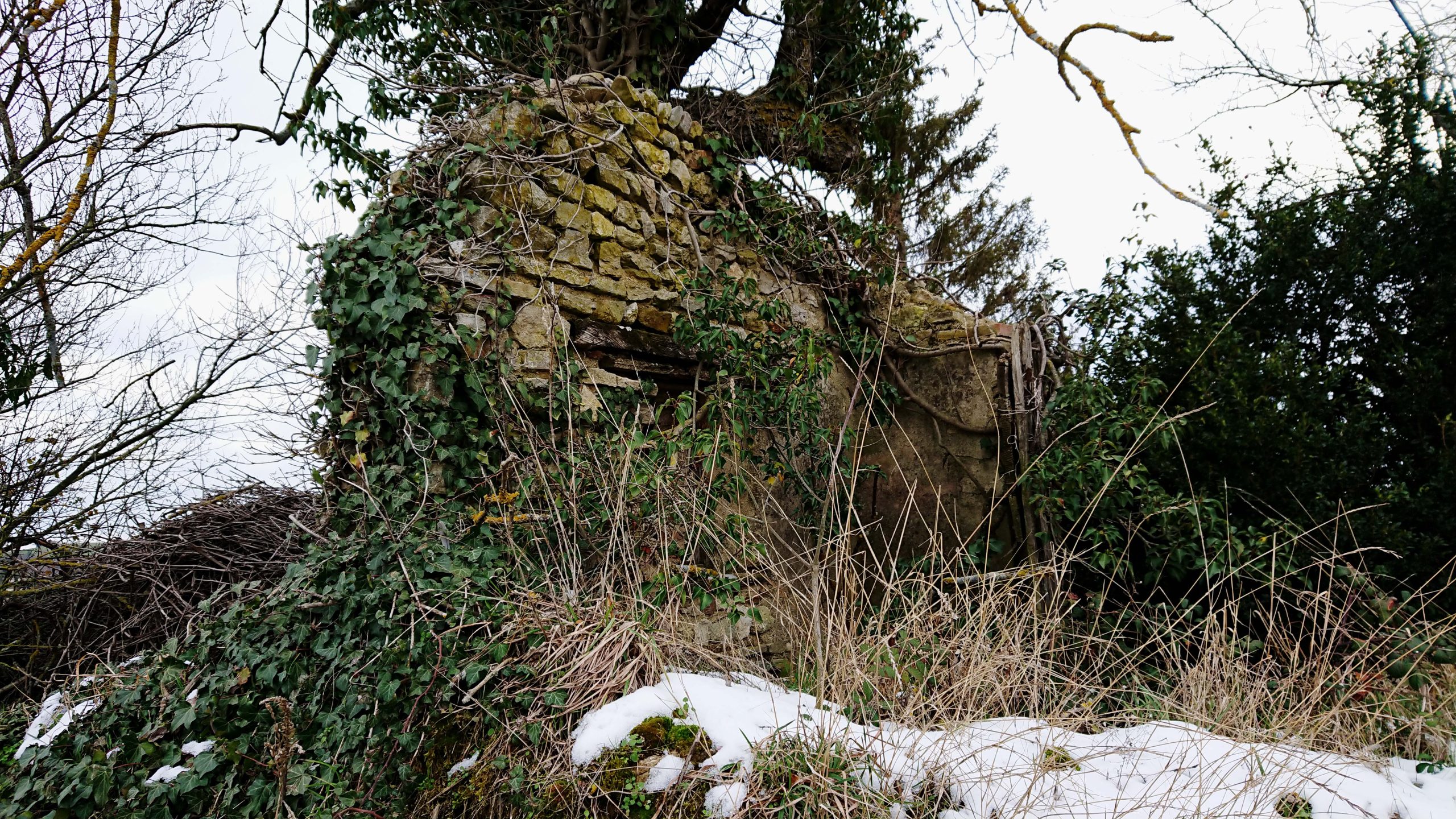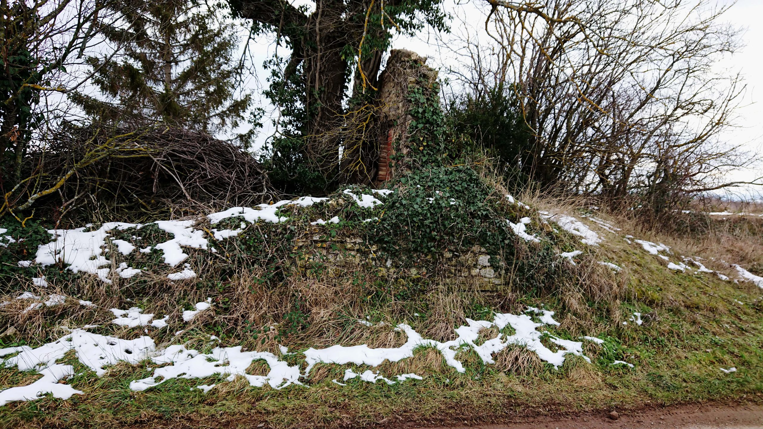 Le froid de l’hiver a fait tomber les feuilles des arbres qui le cachent habituellement. Un pan de mur en moellons calcaires, avec ses montants de fenêtres en briques, se dresse au milieu de la végétation.