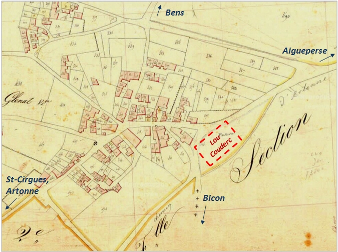 Glénat : situation de la place du Coude sur le plan cadastral napoléonien de 1827 (AD-63 53 FI 35).