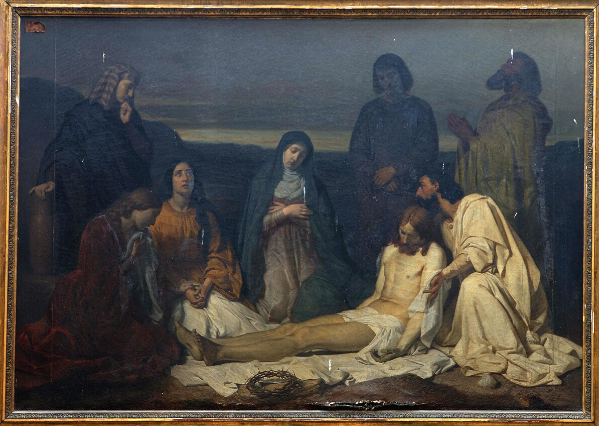 Adolphe Brune, La descente de croix, toile imposante de 3,37m x 2,31m dominant la nef de l’église Notre-Dame d’Aigueperse.