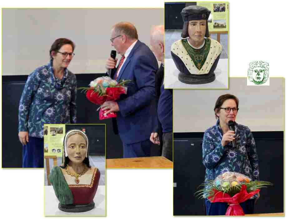 Ce fut ensuite la présentation officielle des bustes de Claire de Gonzague et Gilbert de Montpensier, sculptés et offerts à l’ACAE par Claire Martin. Olivier Paradis la remercia vivement pour cette très belle oeuvre, réalisée en plâtre peint dans le cadre de son atelier d’arts plastiques de Chaptuzat.