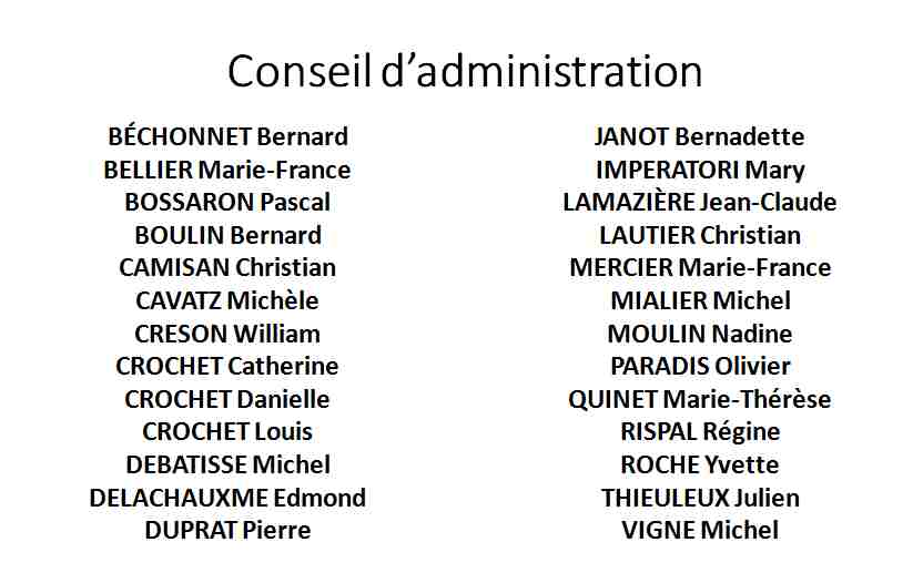 Il fut procédé au renouvellement du Conseil d’administration. Selon leurs souhaits, Odile Gaby et Daniel Morand le quittent. Marie-Thérèse Quinet et Julien Thieuleux acceptent d’y entrer. Le nouveau Conseil est approuvé à l’unanimité des présents et représentés.