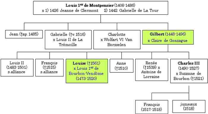 Pour les passionnés d’histoire qui veulent s’accrocher à la généalogie ci-dessous, voici les générations successives qui permettent de remonter à Aigueperse où, derrière les remparts de la ville, avait été installé le palais des Montpensier et à la butte de Montpensier où s’élevait la forteresse éponyme, détruite sur ordre de Richelieu.