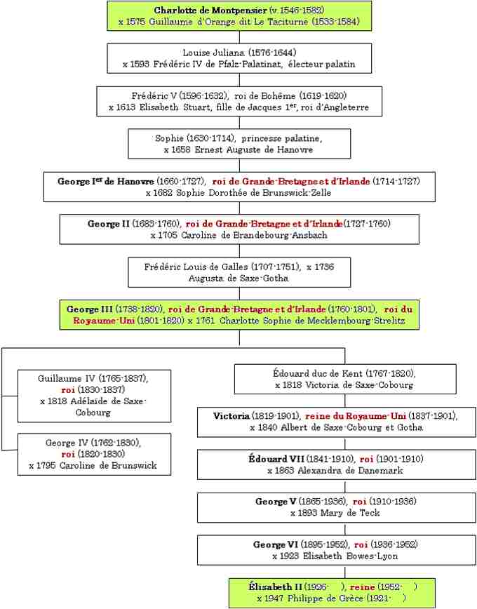 On y apprend que Charlotte de Bourbon-Montpensier, arrière-petite-fille de Gilbert et Claire de Bourbon Montpensier, donna naissance à toute la filiation qui mène à la reine d’Angleterre, Elisabeth II. Il s’en fallut de peu, car Charlotte, abbesse de Jouarre, avait rompu son engagement religieux et pris ses distances par rapport à la religion catholique et sa famille. Réfugiée en Allemagne, elle épousa Guillaume 1er d’Orange-Nassau (1533-1584), dit le Taciturne, stathouder de Hollande (1559). De cette union (c’était sa troisième épouse) naquirent cinq filles dont Louise Juliana (1576-1644) qui, mariée en 1593 à Frédéric prince électeur de Pfalz-Palatinat, fut à l’origine de la dynastie anglaise avec, à la neuvième génération, la reine Victoria, et, à la treizième, Élisabeth II !