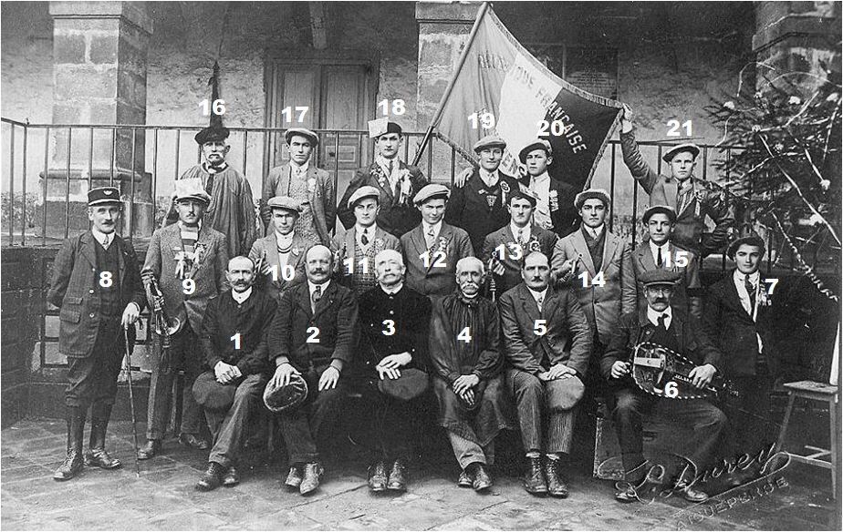 L’Association culturelle d’Aigueperse et ses environs (ACAE) a été contactée par un ancien élève du célèbre vielleux montluçonnais Gaston Rivière*. Il a réuni une collection de 500 à 600 photographies de vielleux d’autrefois et il souhaiterait savoir comment s’appelait celui (n°6 sur la photo) qui, dans l’entre-deux guerres**, accompagna ces conscrits de Montpensier venus passer leur conseil de révision à Aigueperse.