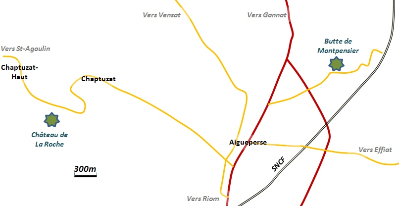 Le sentier d’accès est jalonné d’anciennes bornes qui, sous l’Ancien Régime, délimitaient les différentes parcelles de la forêt de Montpensier. Elles en portent encore les toponymes. Arrivés au sommet de la butte, à l’emplacement où s’élevait autrefois une puissante forteresse, un superbe panorama de 360° sur la plaine et les coteaux de Limagne s’offrit aux participants, lieu idéal pour une photo de groupe, sous un éclatant soleil.