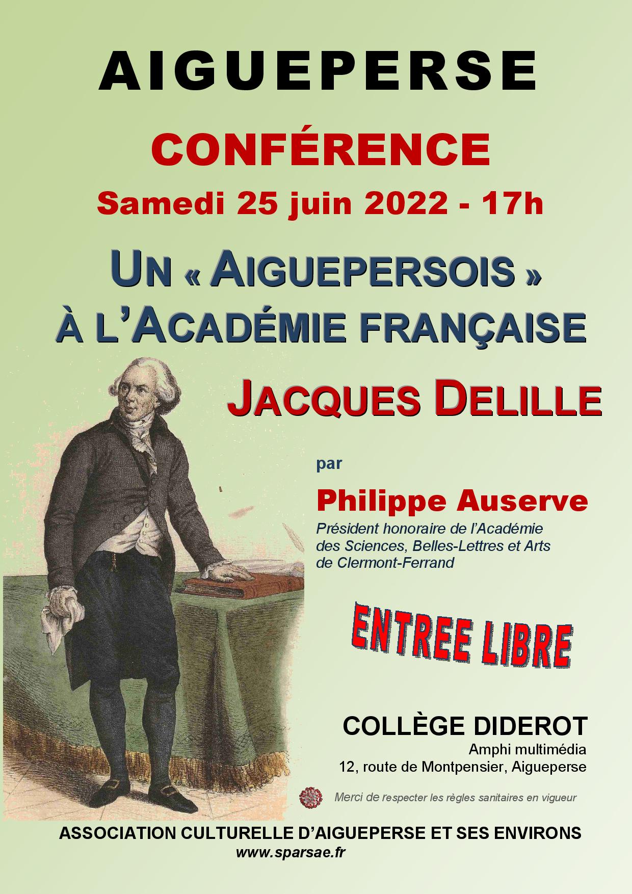 À l’invitation de l’Association culturelle d’Aigueperse et ses environs (ACAE), samedi 25 juin, Philippe Auserve, président honoraire de l’Académie des Sciences, Arts et Belles-lettres de Clermont-Ferrand, fondateur et conservateur du Musée des peintres de l’École de Murol, a présenté au collège Diderot d’Aigueperse, une conférence sur « Jacques Delille, ‘Aiguepersois’ à l’Académie française ».