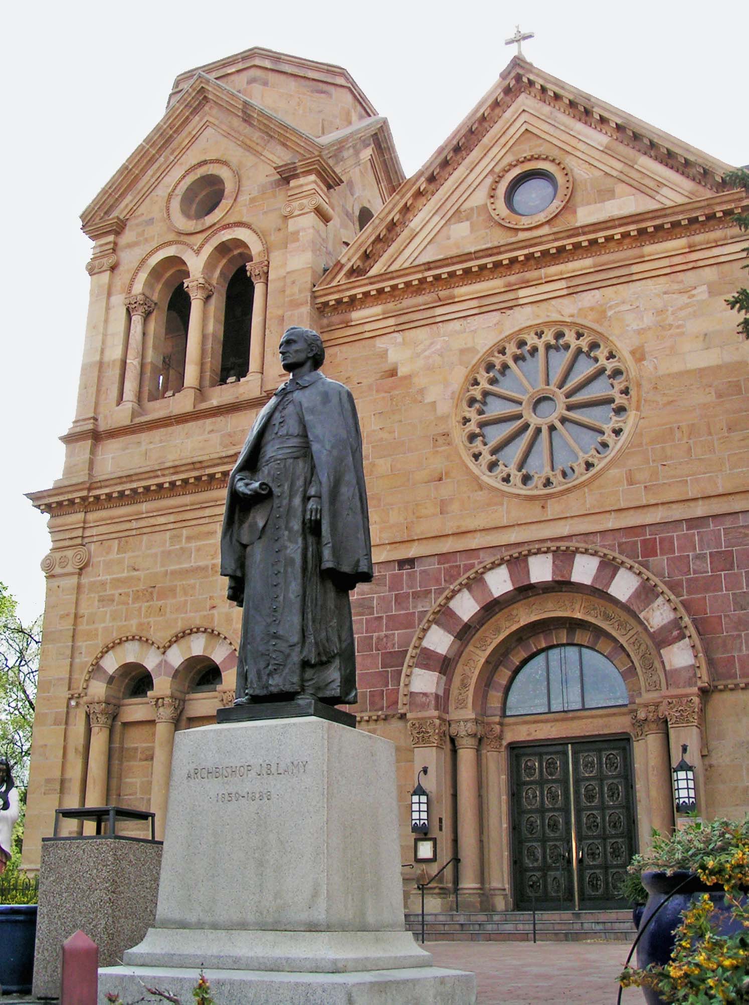 Cathédrale Saint-François d’Assise de Santa Fé (N.M.) et statue en bronze de Mgr J.B. Lamy, 1er archevêque de Santa Fé (inaugurée par Mgr Pitaval, 5e archevêque, le 23 mai 1915).