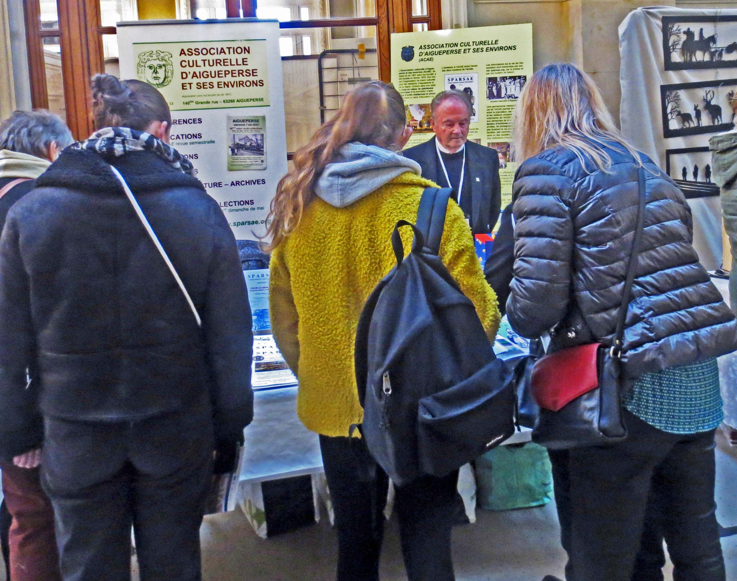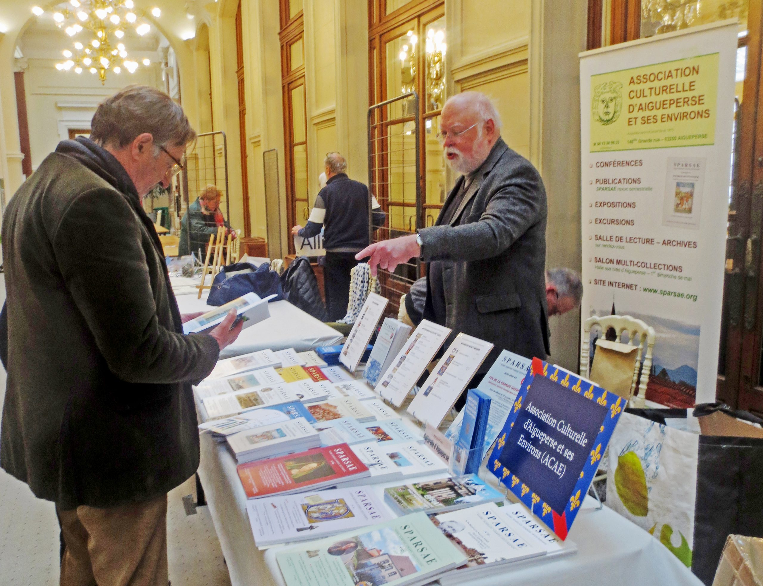 Les visiteurs qui s’arrêtèrent au stand de l’ACAE purent bien sûr découvrir nos revues, mais également se documenter sur nos différentes activités, et, pour un assez grand nombre d’interlocuteurs, nous parler de leur relation avec Aigueperse ou sa région, qu’elle soit familiale, amicale ou découlant d’une recherche particulière telle que celles sur les traces d’un ancêtre, ou simplement partant d’un souvenir…