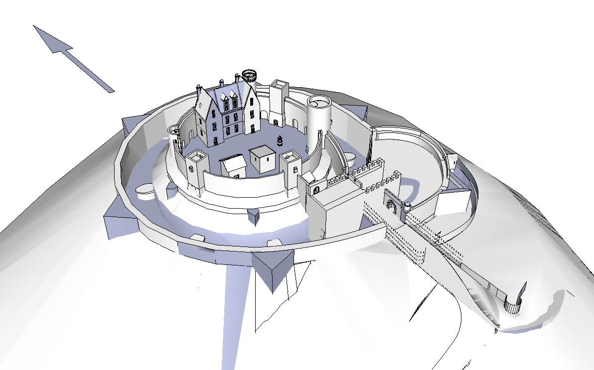 Vue Sud Ouest de la forteresse de Montpensier. Restit 3D, déc. 2021. Droits réservés.